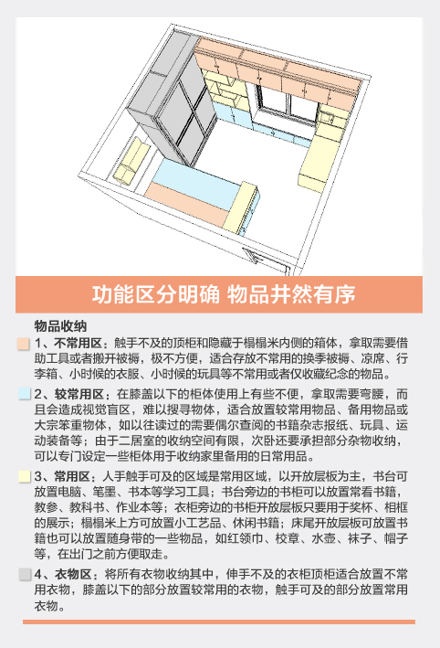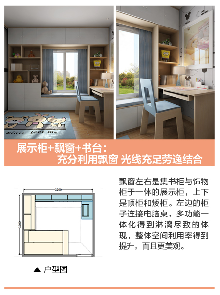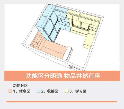这样的设计是非常具前瞻性的,设计师不但考虑到了孩子们在不断成长,同时也有考虑到二居室对于次卧收纳的强烈需求。在功能分区上,设计师利用房间中间的飘窗,充分利用飘窗的位置,对整个房间的空间进行了“学习区”,“收纳区”,“休息区”三大分区。