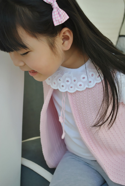 粉色的小开衫,两个肩膀都有蝴蝶结,粉粉的可爱