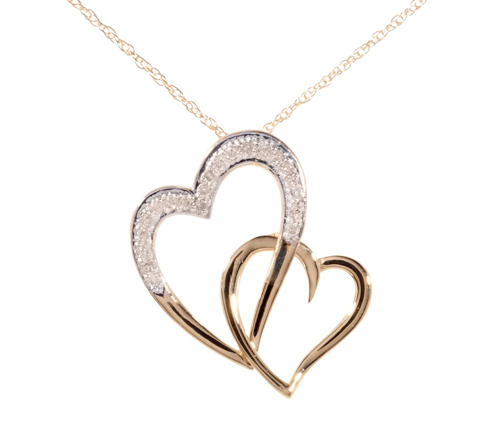 推荐其中不错的一款:镶钻10k金双心吊坠项链,$99.99,4折,约合人民币635元。黄金为10k,镶钻1.5g,共21颗。钻石参数为1/10 cttw, I-J Color, I1-I2 Clarity。总体来看,是款货实漂亮,寓意不错的项链。