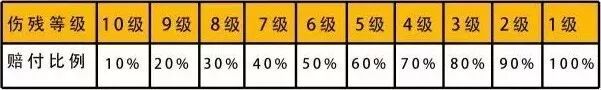 意外伤残保障的内容依据行业发布的《人身保险伤残评定标准》,分为1-10级,8大类共281项。伤残赔付比例与伤残等级相对应,具体如下: